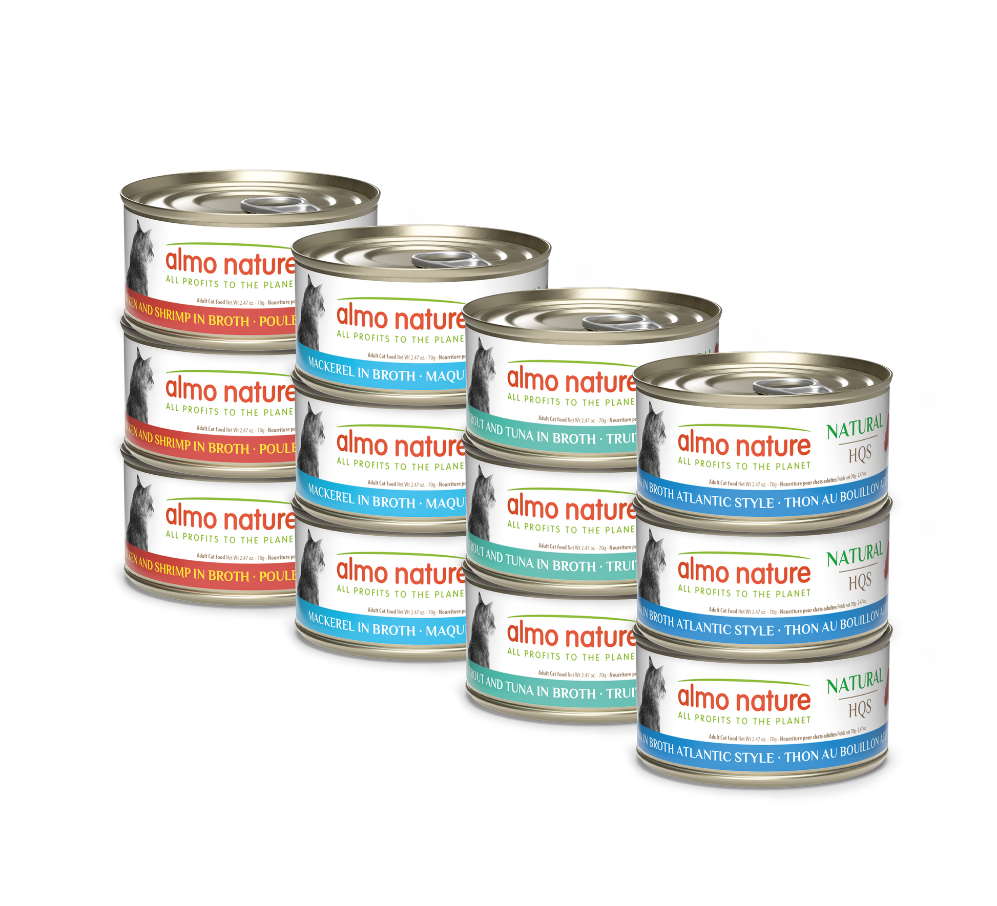 Almo Nature's HQS Natural Rotational Pack 2 Grain-Free Canned Cat Food comes with 4 healthy and flavorful recipes to rotate between: Atlantic Tuna, Mackerel, Trout & Tuna, Chicken & Shrimp. Made with real, all-natural fish or chicken as the first ingredient and cooked in minimal water to create a moist, tasty broth, they deliver simplicity and authenticity that even the finickiest of cats will adore. The meals are free of preservatives and additives, and naturally rich in highly digestible proteins (min. 15% to 17%), essential amino acids and micronutrients to help your cat thrive. Plus, every bite is crafted with HQS (High Quality Sourced) ingredients—meat and fish originally fit for human consumption and now solely used for pet food to help nourish your furry friend!